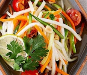 신선한 콜라비를 얇게 썰어 다양한 채소와 함께 섞어 샐러드로 만들 수 있습니다. 콜라비의 아삭한 식감이 샐러드에 산뜻한 맛을 더합니다.